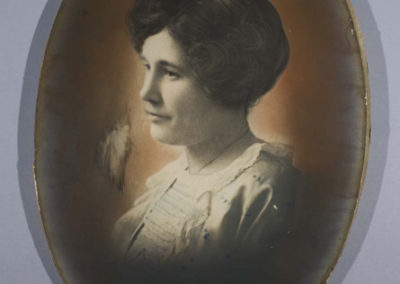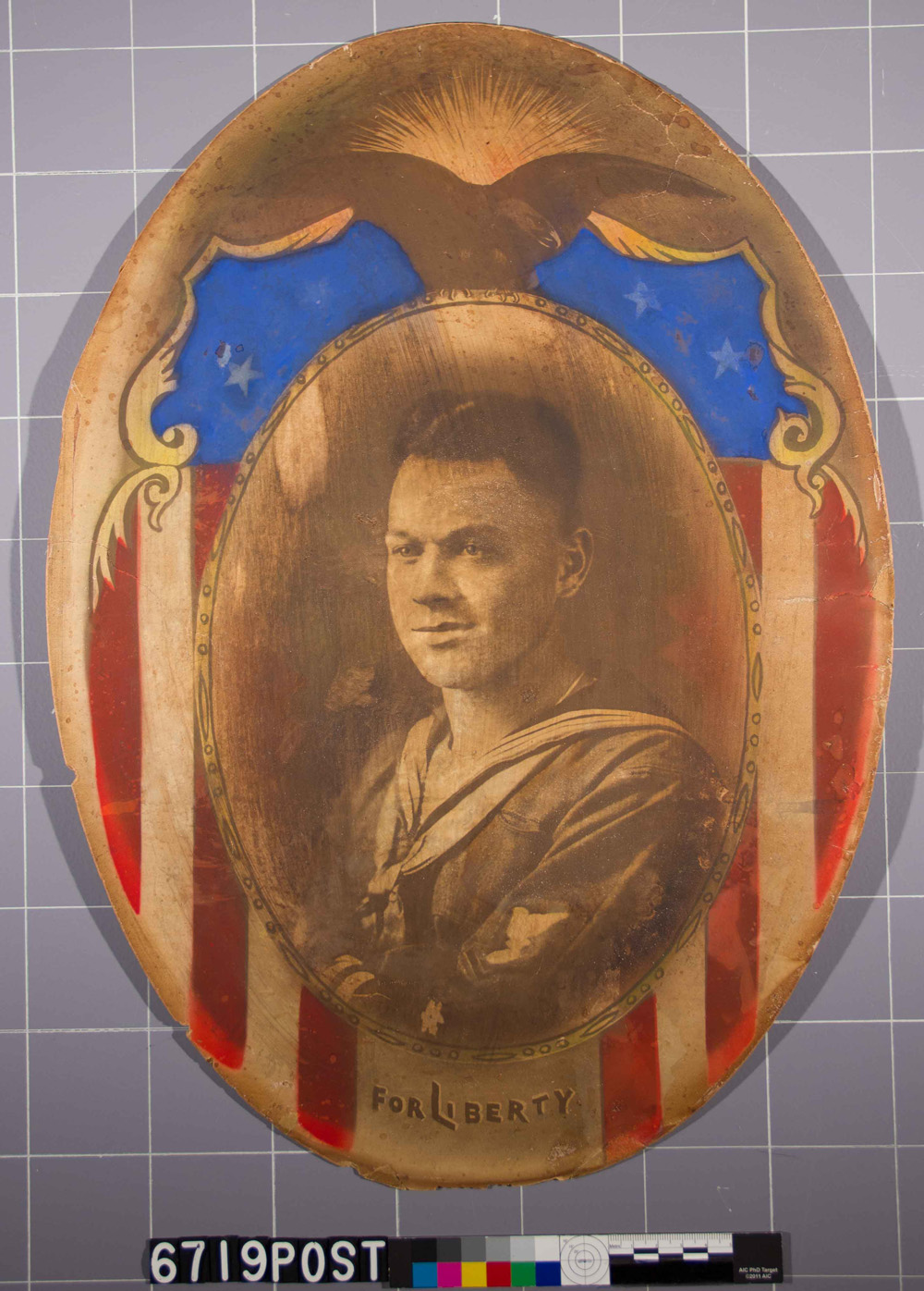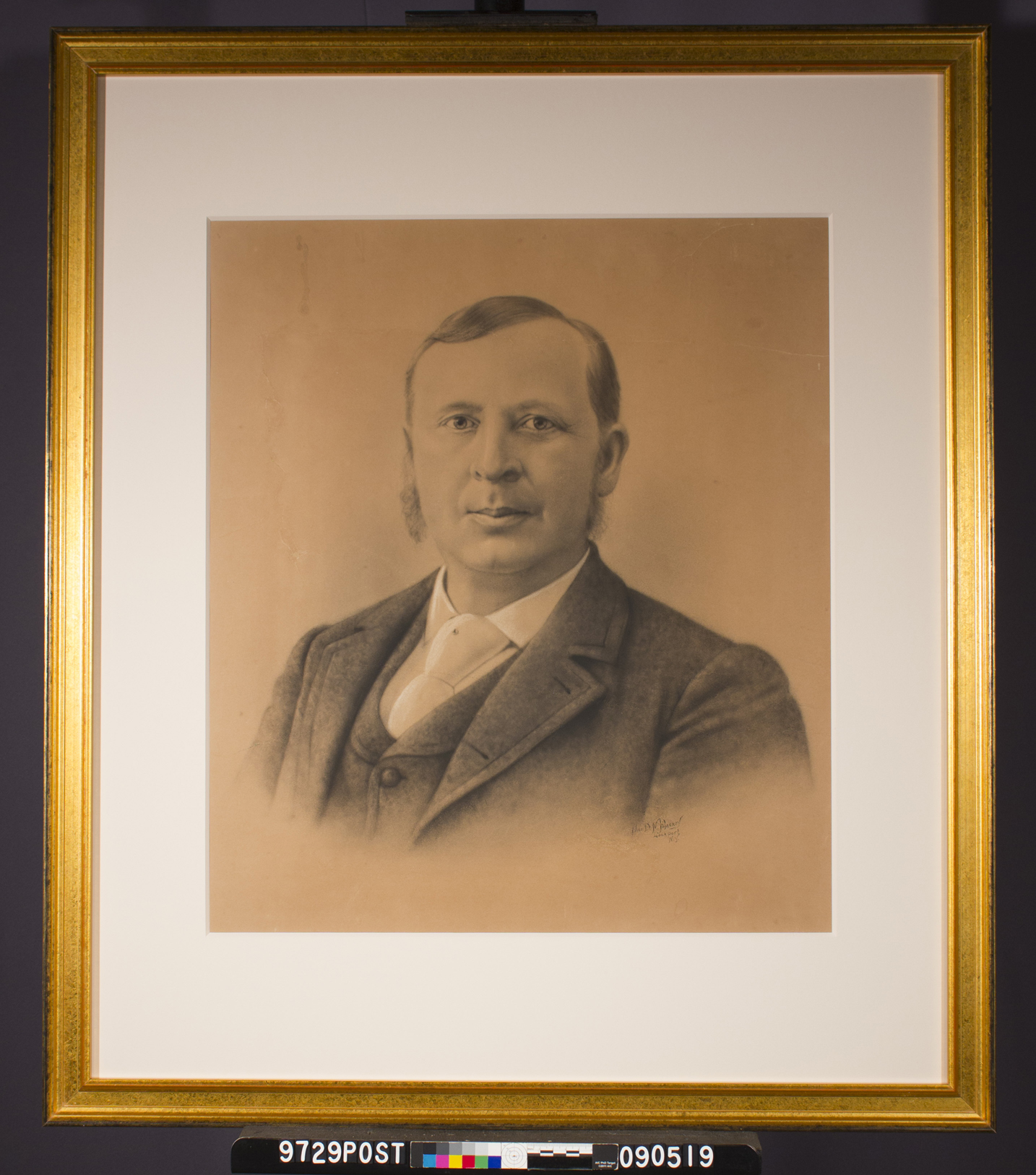 Crayon portrait after light bleaching, lining and inpainting, framed with preservation housing