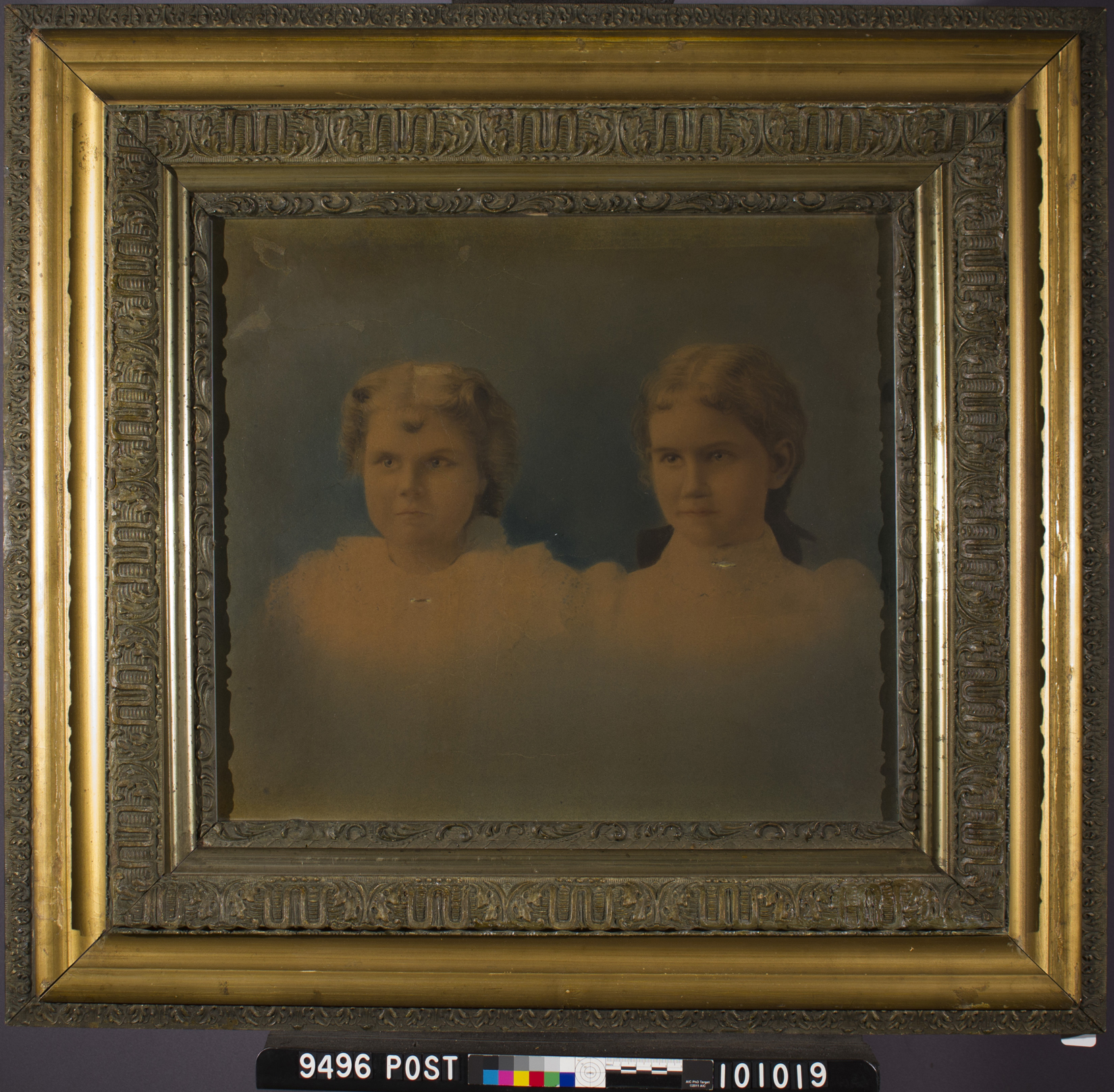 Two crayon portraits after surface cleaning and inpainting of areas of loss