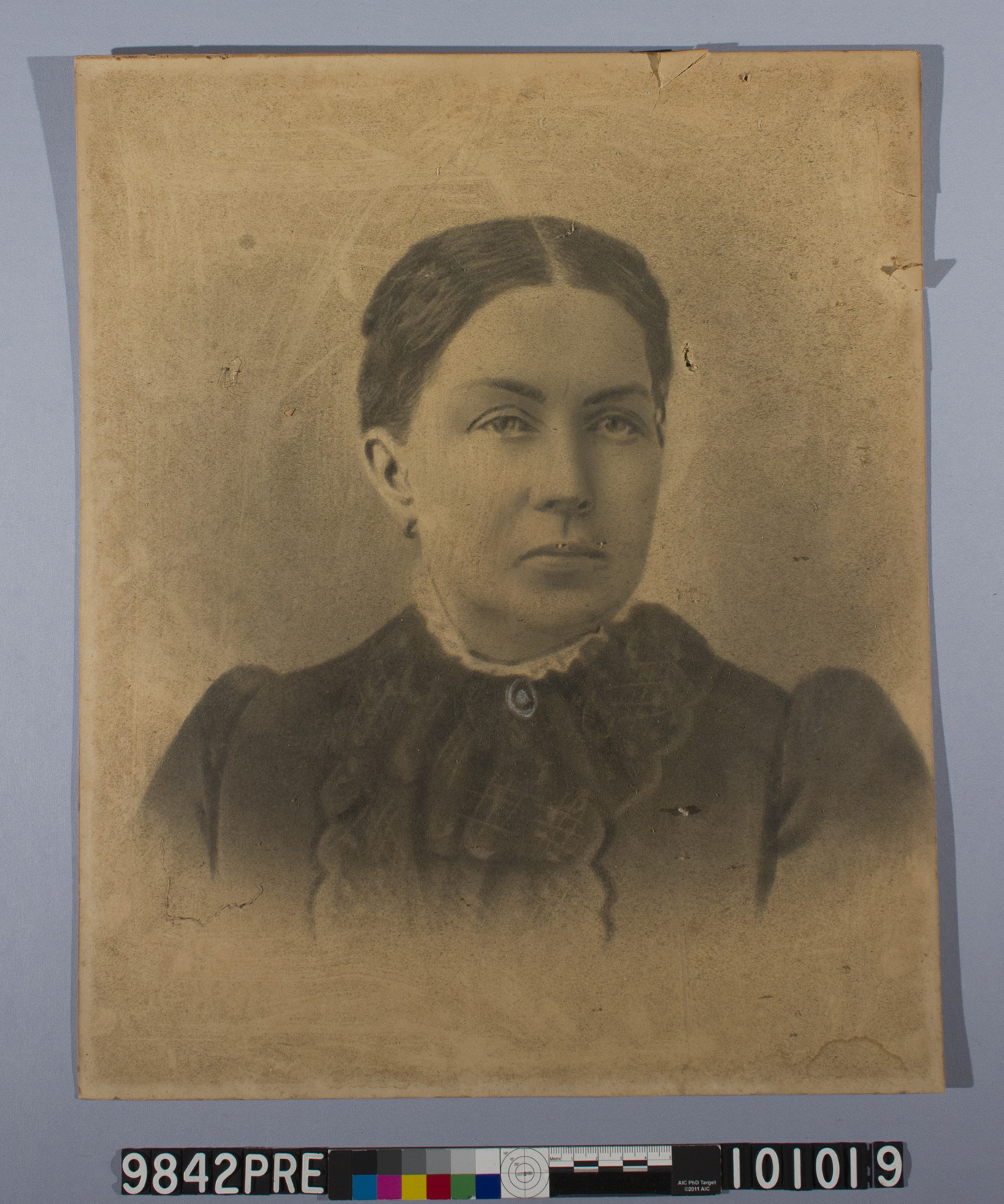 9842 Crayon portrait before treatment showing support discoloration and surface dirt