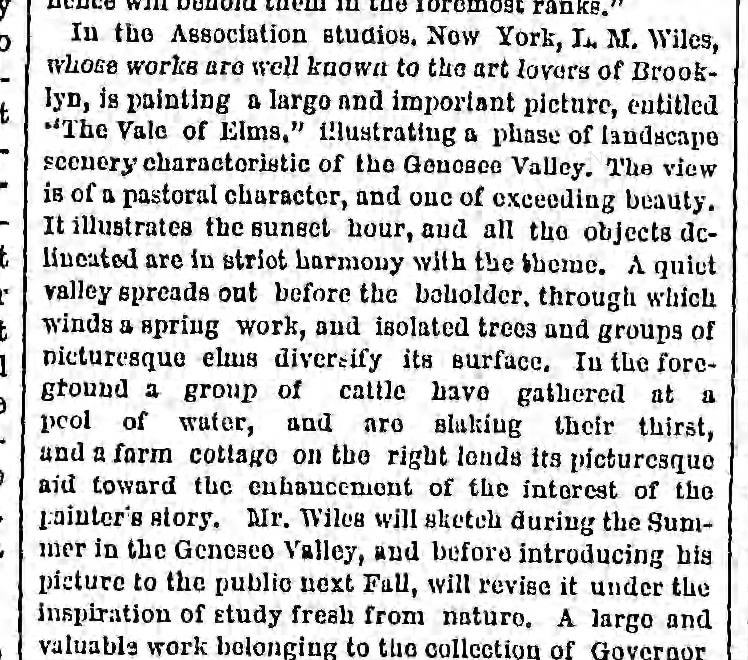 A review describing The Vale of Elms in the Brooklyn Eagle, 1871. Another review of the period mentioned that “The strong and mellow light over the whole picture is delicious, and the effect of atmosphere is rendered with consummate ability.”